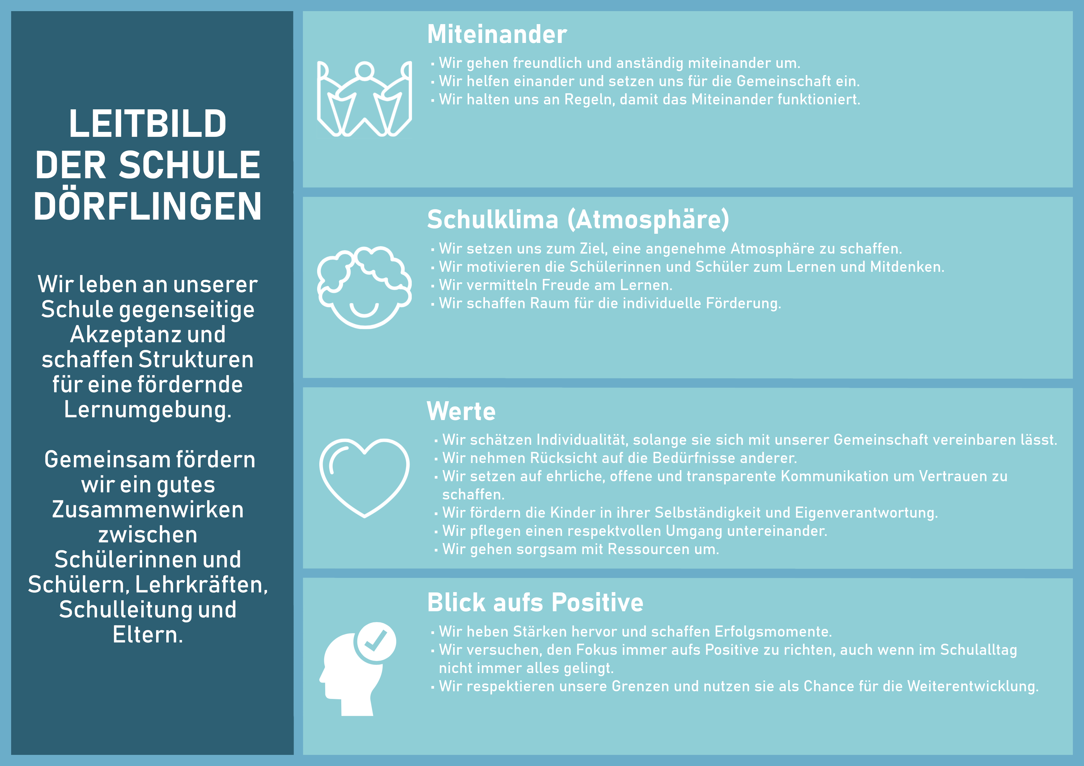 Darin werden die grundlegenden Wertehaltungen der Schule festgehalten. Es dient als Wegweiser für alle an der Schule beteiligten Personen, zeigt unsere Haltungen, Werte, Ziele und Visionen auf.